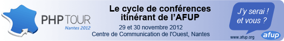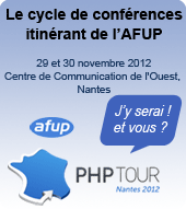 Publié le 10/10/2012Vous serez des nôtres les 29 et 30 novembre 2012 ? Vous souhaitez annoncer votre venue au PHP Tour Nantes 2012 ?